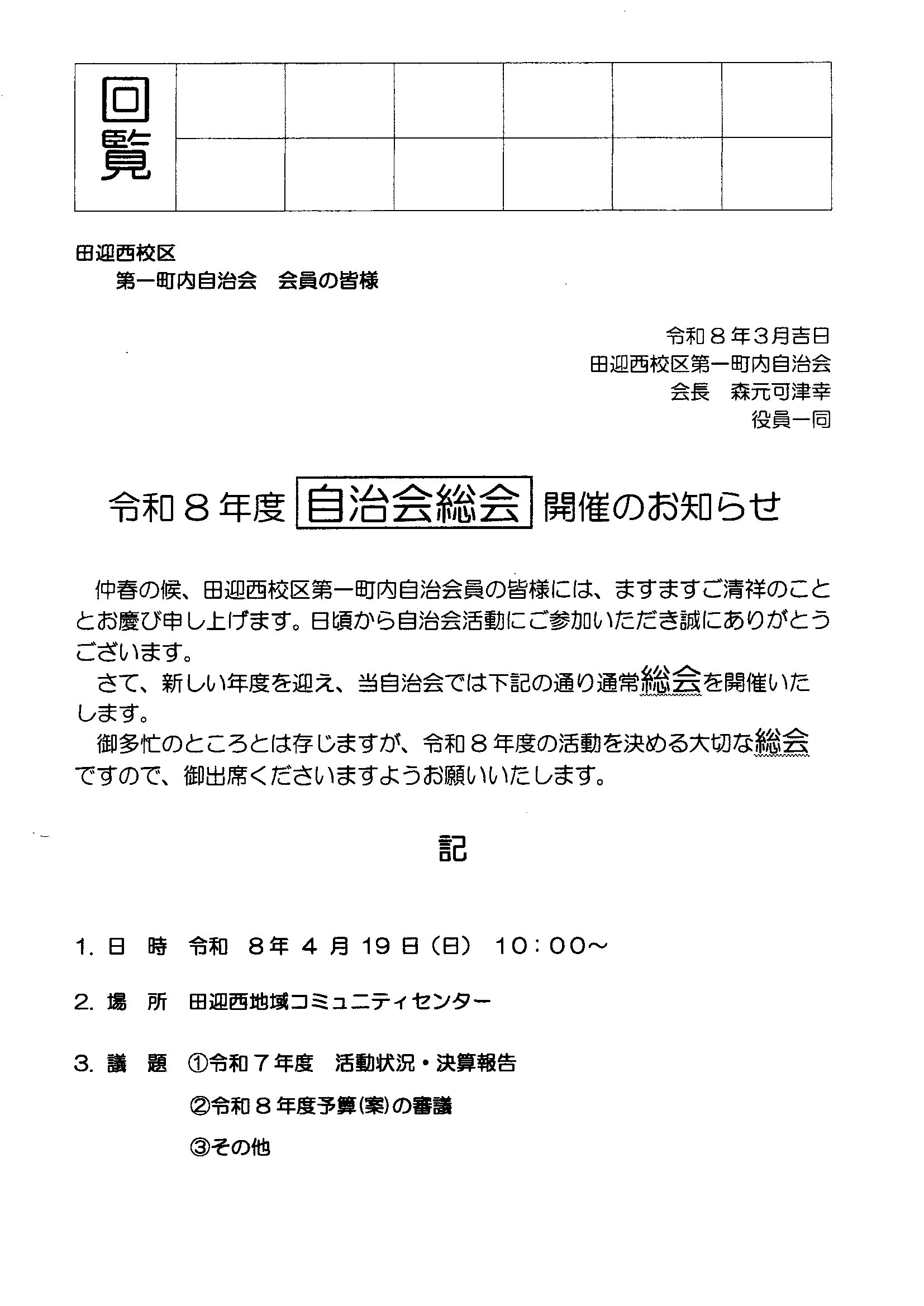 - 4/19 1町内自治会総会開催のお知らせ