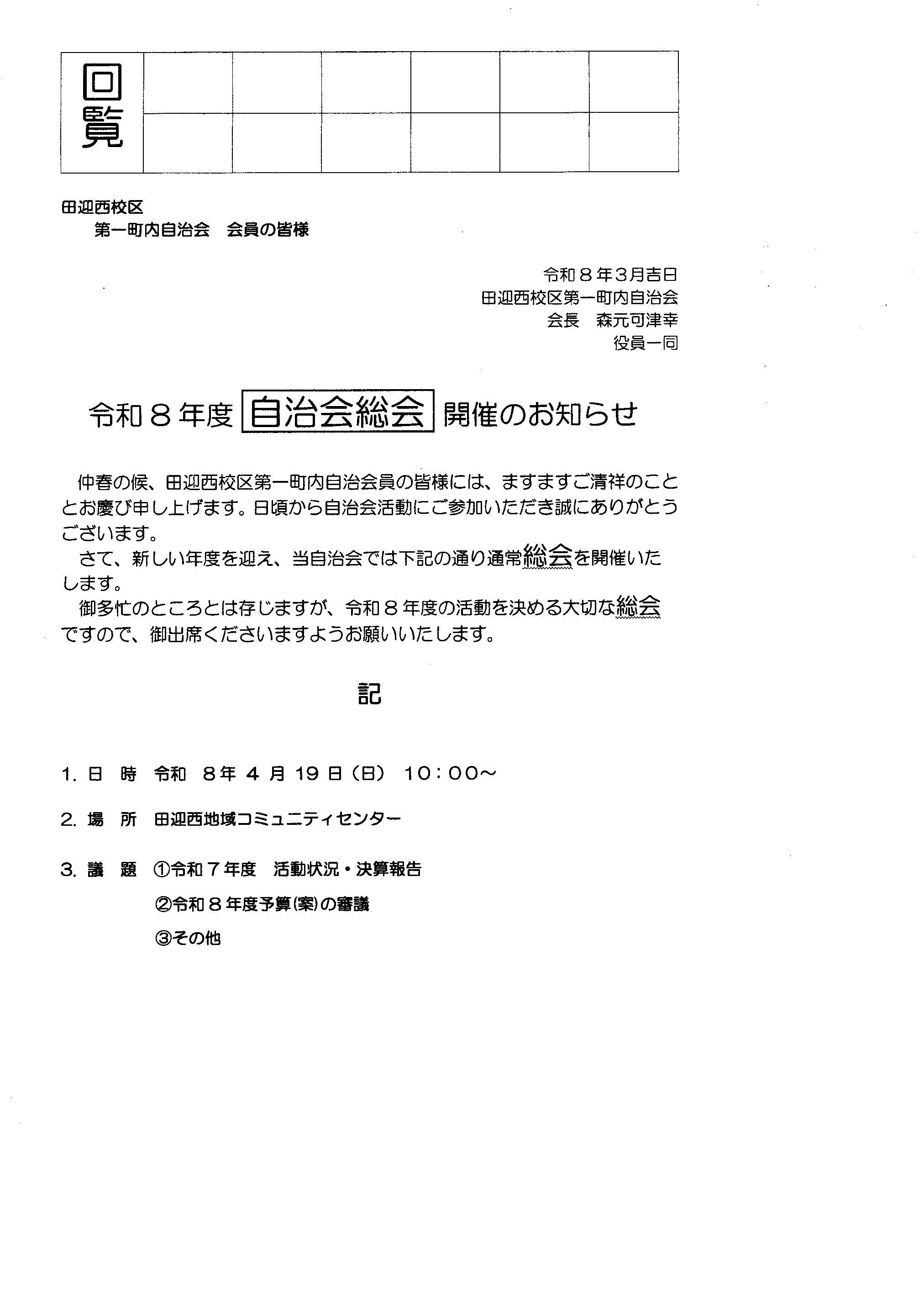 1町内自治会総会開催のお知らせ
