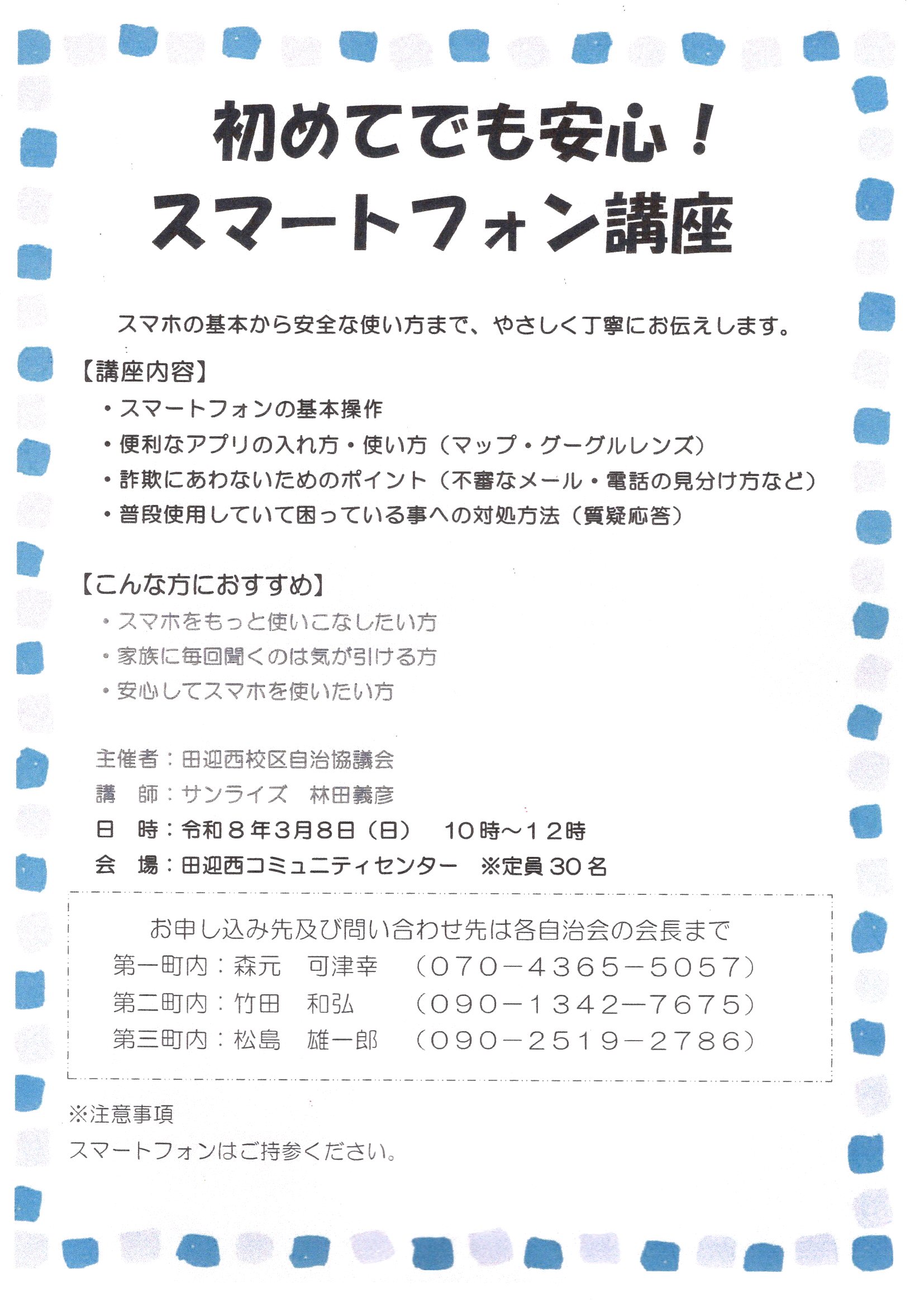 ホームページをリニューアルしました! 「田迎西校区まちづくり」のホームページをご覧いただき、誠にありがとうございます。 この度、ホームページをリニューアルいたしました。 スマートフォンでの表示にも対応できるよう、デザイン・メニュー等を見直しました。 これからも、より使いやすく、より見やすいホームページを目指して、 コミセンや校区の情報をたくさん発信し、内容拡充に努めて参りますので、 今後ともどうぞよろしくお願い致します。